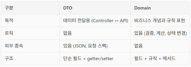 비즈니스 로직 없음: 계산, 검증은 Service나 Domain에서.
