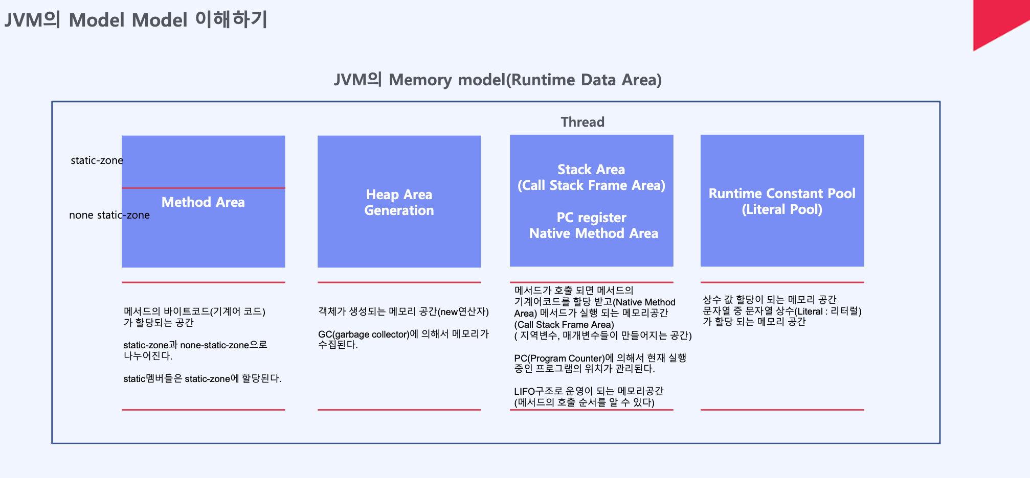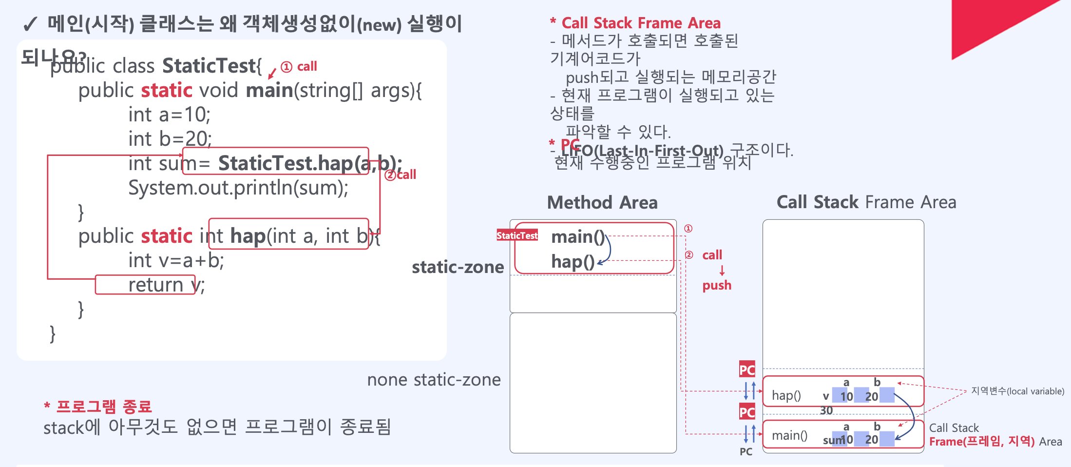 - static-zone에 있는 main()메서드가 먼저 실행되고 Heap Area에 객체를 생성