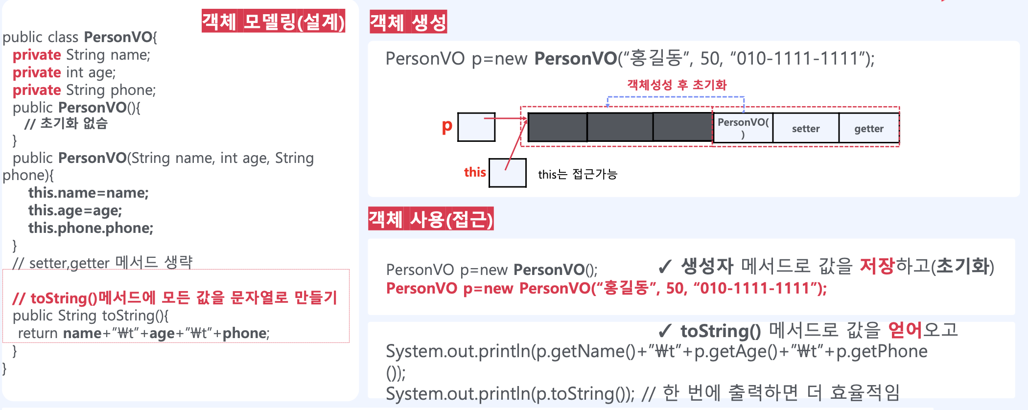 - Object객체에 내장되어있는 toString()메서드를 재정의하여 객체가 가지고 있는 모든 값을 출력할 수 있다.
