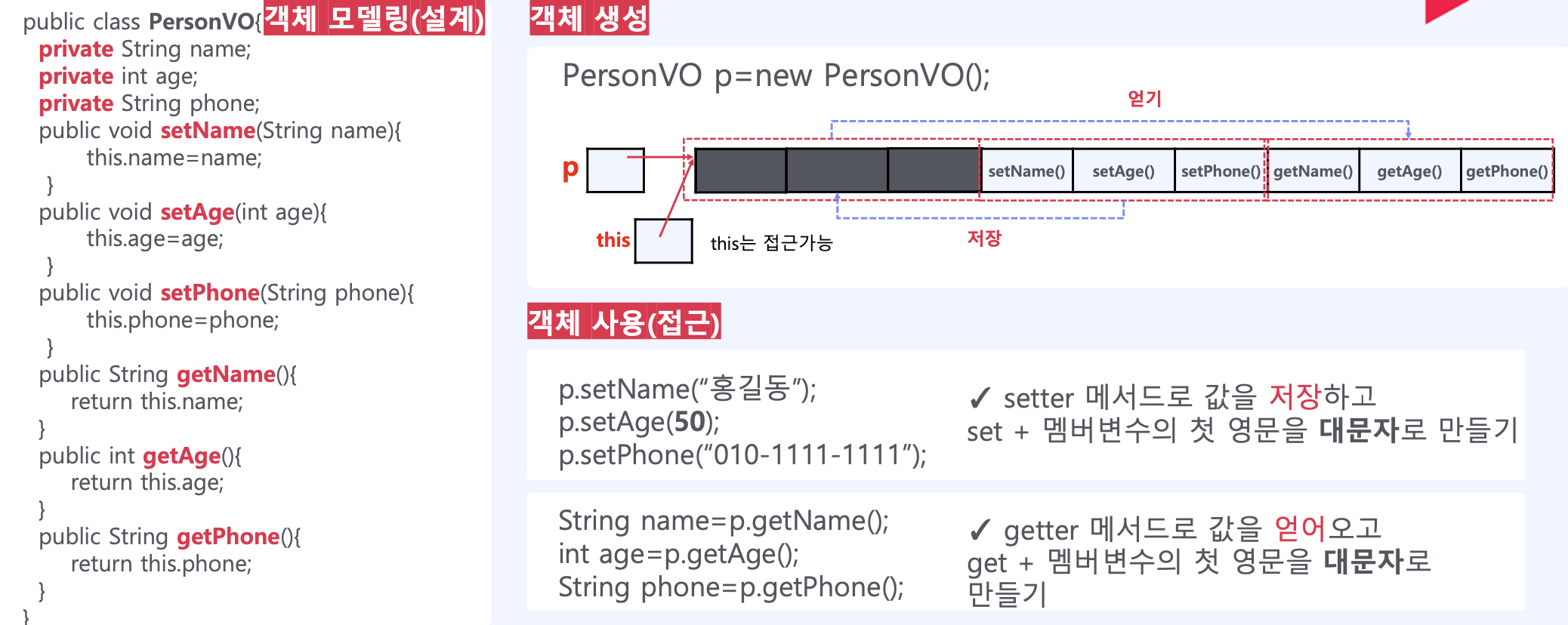 - 정보은닉된 데이터에 접근할 수 있는 방법으로 setter,getter와 생성자가 있다.