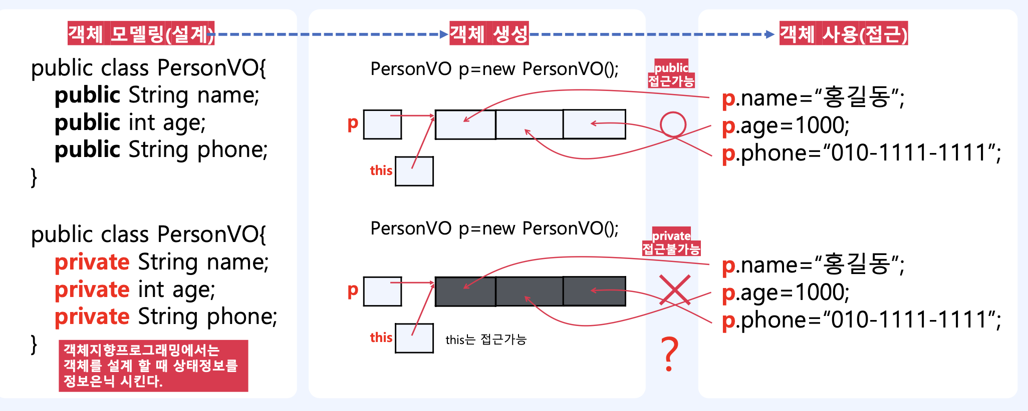 - 다른 객체에게 자신의 정보를 숨기고(private) 동작, 기능(메서드) 만을 통해 접근을 허용하는 것