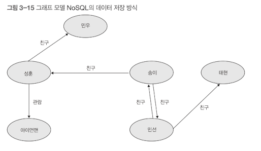 그래프 모델 NoSQL을 관계형 데이터베이스의 구성요소와 대응시키면 엔티티 테이블은 노드, 관계 테이블은 노드 간의 관계가 된다. 그래프 데이터베이스의 장점은 관계를 통해 부가 정보를 조회할 수 있는 데 있다.