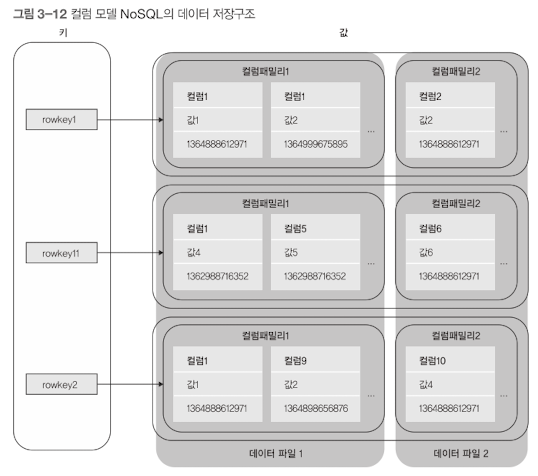 대부분의 컬럼 모델 NoSQL은 구글 빅테이블의 영향을 받아 개발됐다. 이러한 이유로 로우키, 컬럼키, 컬럼 패밀리키 같은 빅테이블 개념이 공통적으로 사용된다. 컬럼 모델 NoSQL에서 컬럼 하나를 조회할 때는 행을 구분하는 로우키와 열을 구분하는 컬럼키를 사용한다. 마치 스프레드시트에서 X축, Y축에 따라 셀을 조회하는 방법과 동일하다. 컬럼 모델 NoSQL로는 HBase, 카산드라, 하이퍼 테이블 등이 있다.