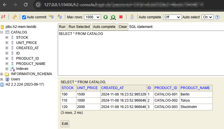 values ('CATALOG-002', 'Tokyo', 110, 1000);