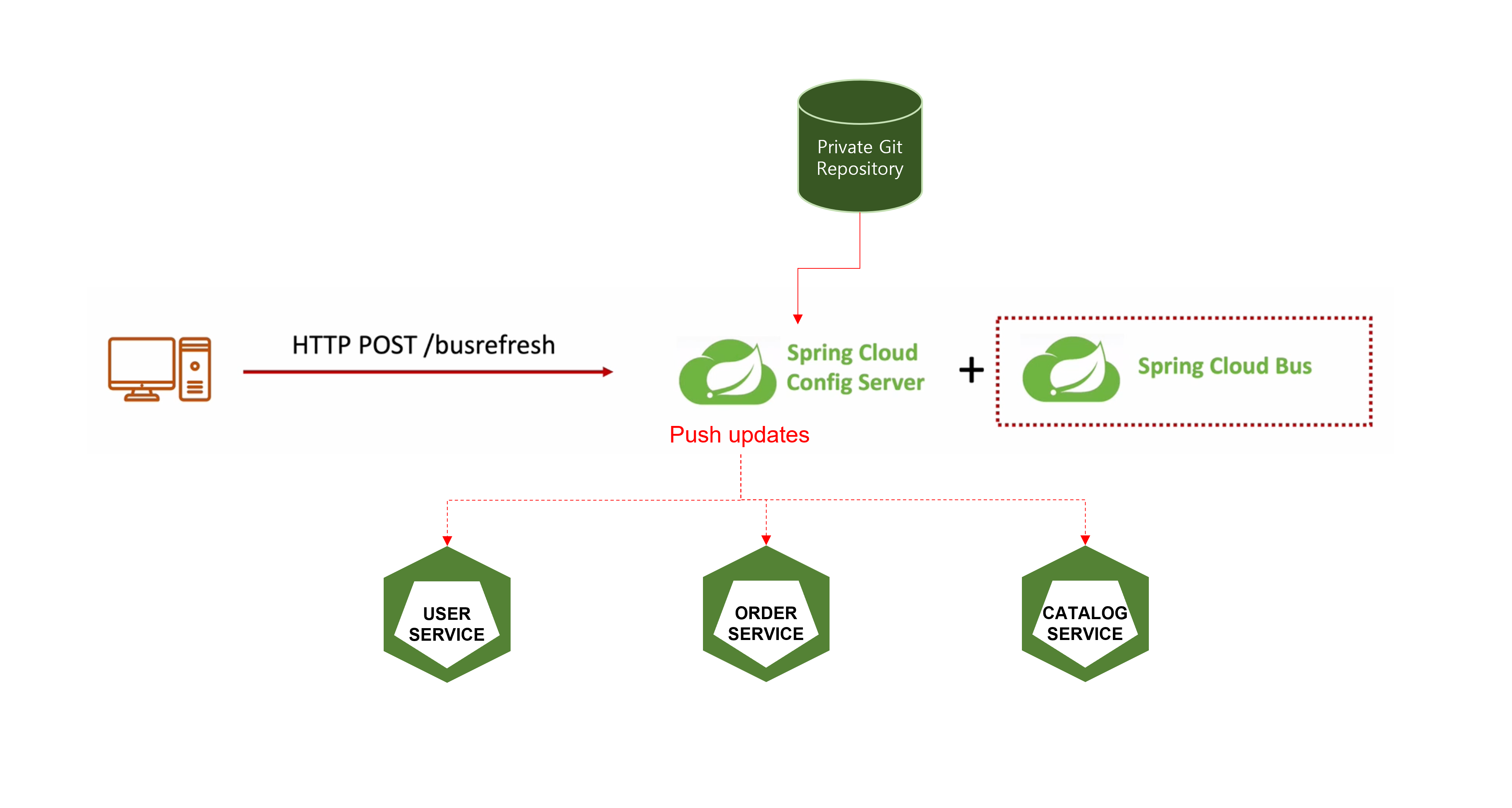 Spring Cloud Config의 변경 내용을 각 마이크로서비스에 적용하는 방법은 다음과 같다.
