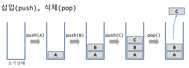 - 스택에 자료를 삽입하거나 스택에서 자료를 꺼낼 수 있다.