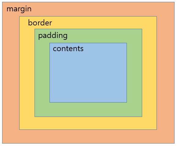 - 내용(content), 안쪽 여백(padding), 테두리(border), 외부 간격(margin)으로 구성