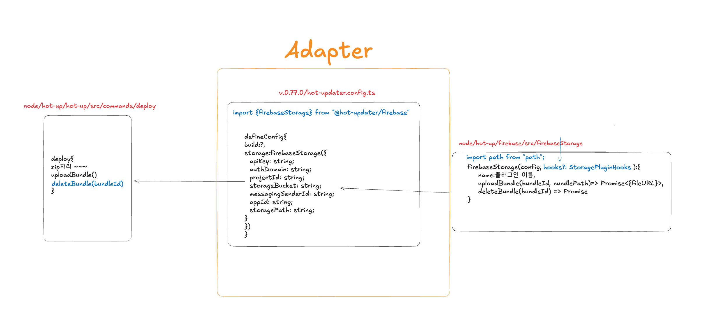 이렇게 서로 다른 plugin들을 하나의 기능으로 통합시키는, 추상화 하는 녀석이 Adapter인데 이게 hot-updater.config.ts에서 하는 역할이더라.