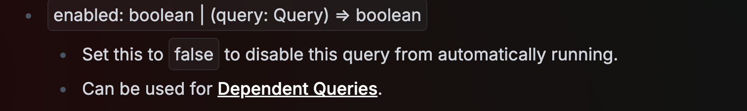 그래서 React-query에서는 이러한 상황을 막기 위해 Enabled라는 옵션을 제공한다.