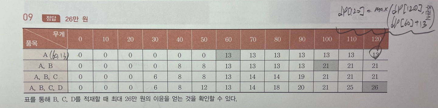 만약 분할가능 배낭문제였다면, 물건 4를 1개 선택하고, 물건 1의 1/3개를 선택하면 최대가 된다.