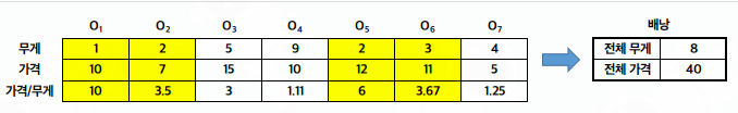 1) O1 선택 -> 가치 합: 10, 남은 무게: 7
