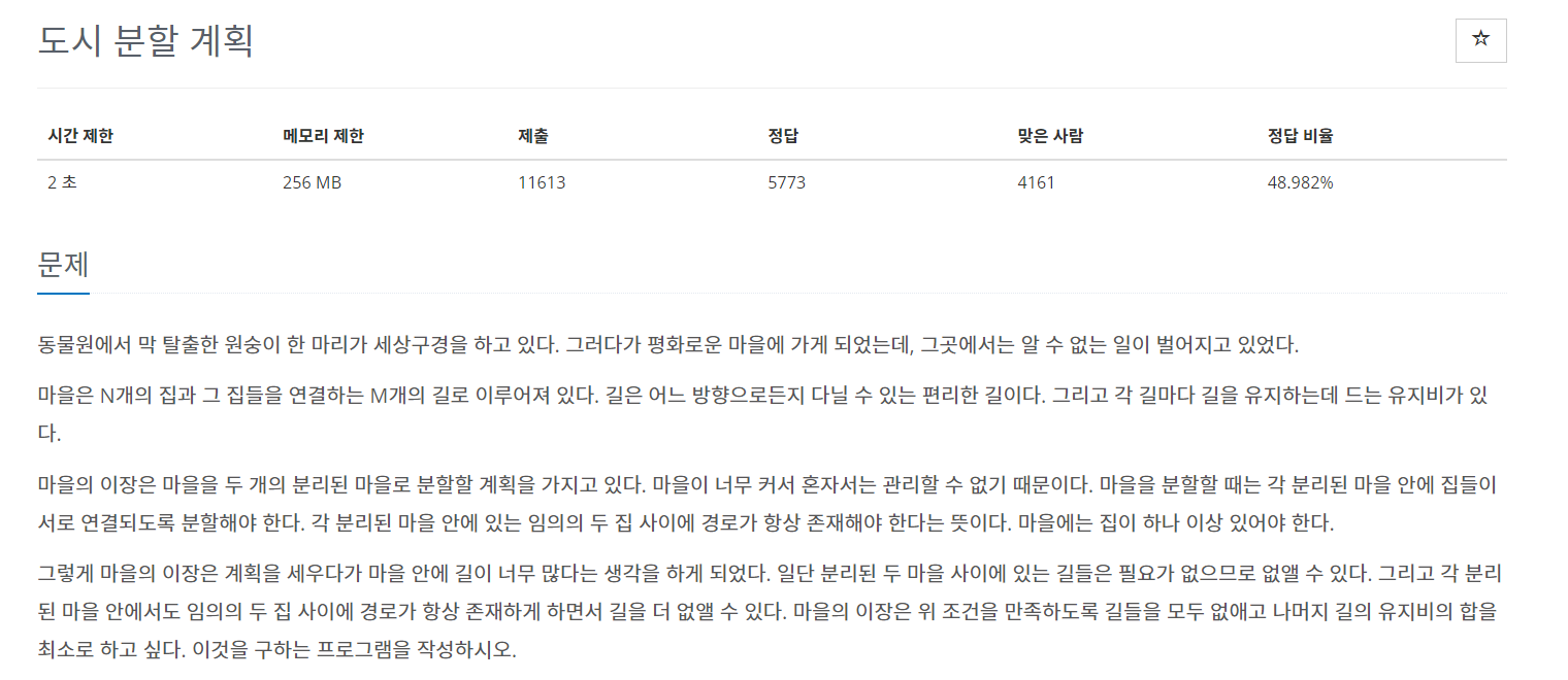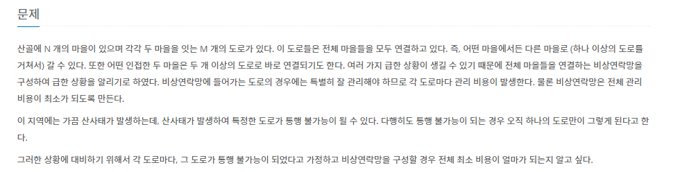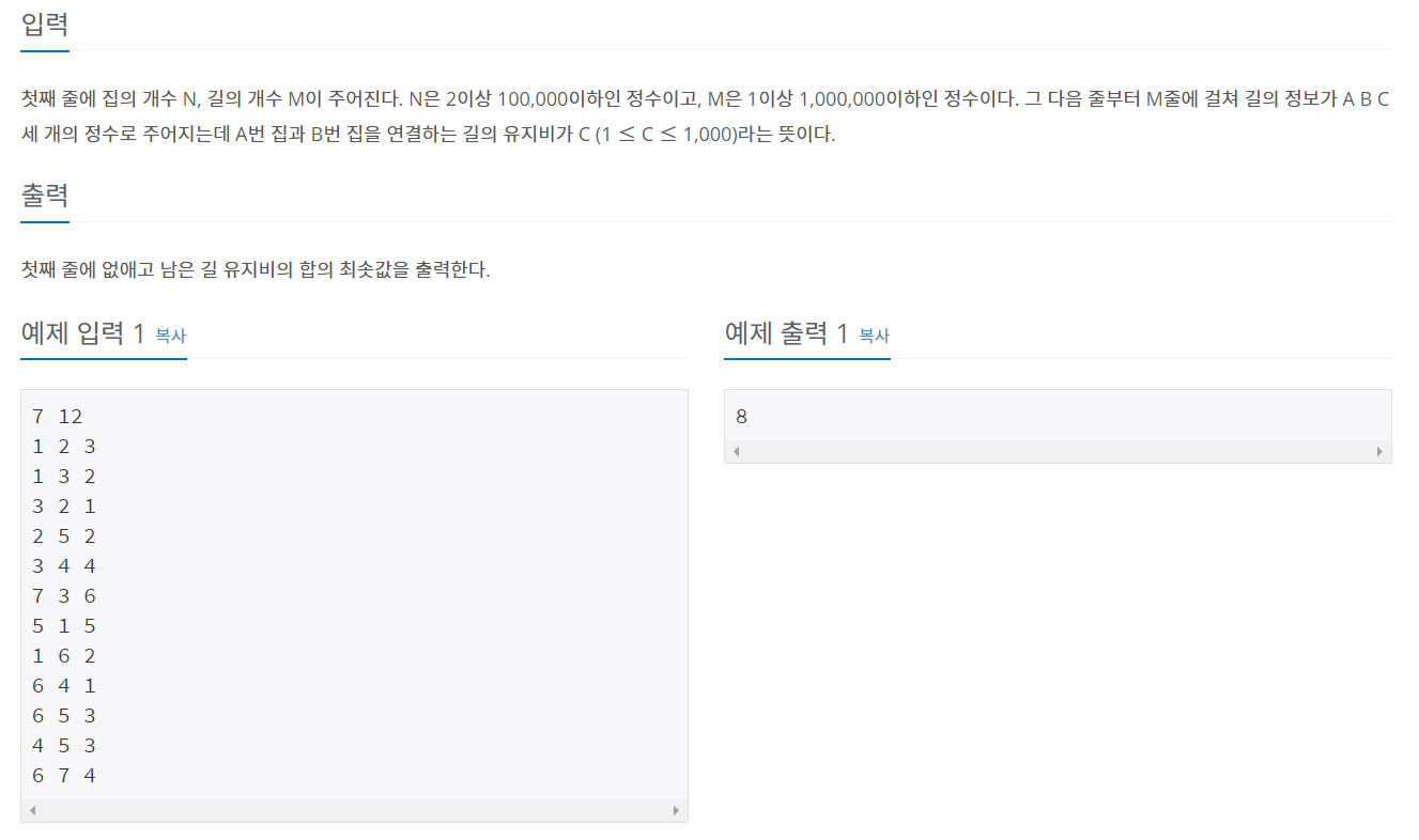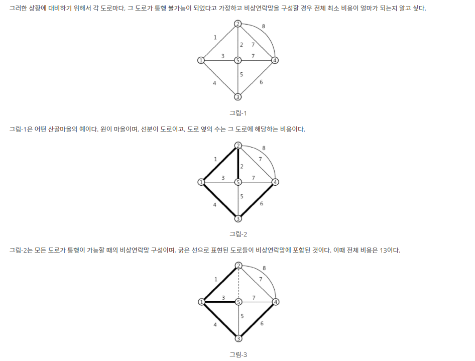 (1) 마을 안에서 임의의 두 집 사이에 경로가 항상 존재하게 하면서 길을 없앨 수 있다. 그러면서 길의 유지비를 최소로 만든다.