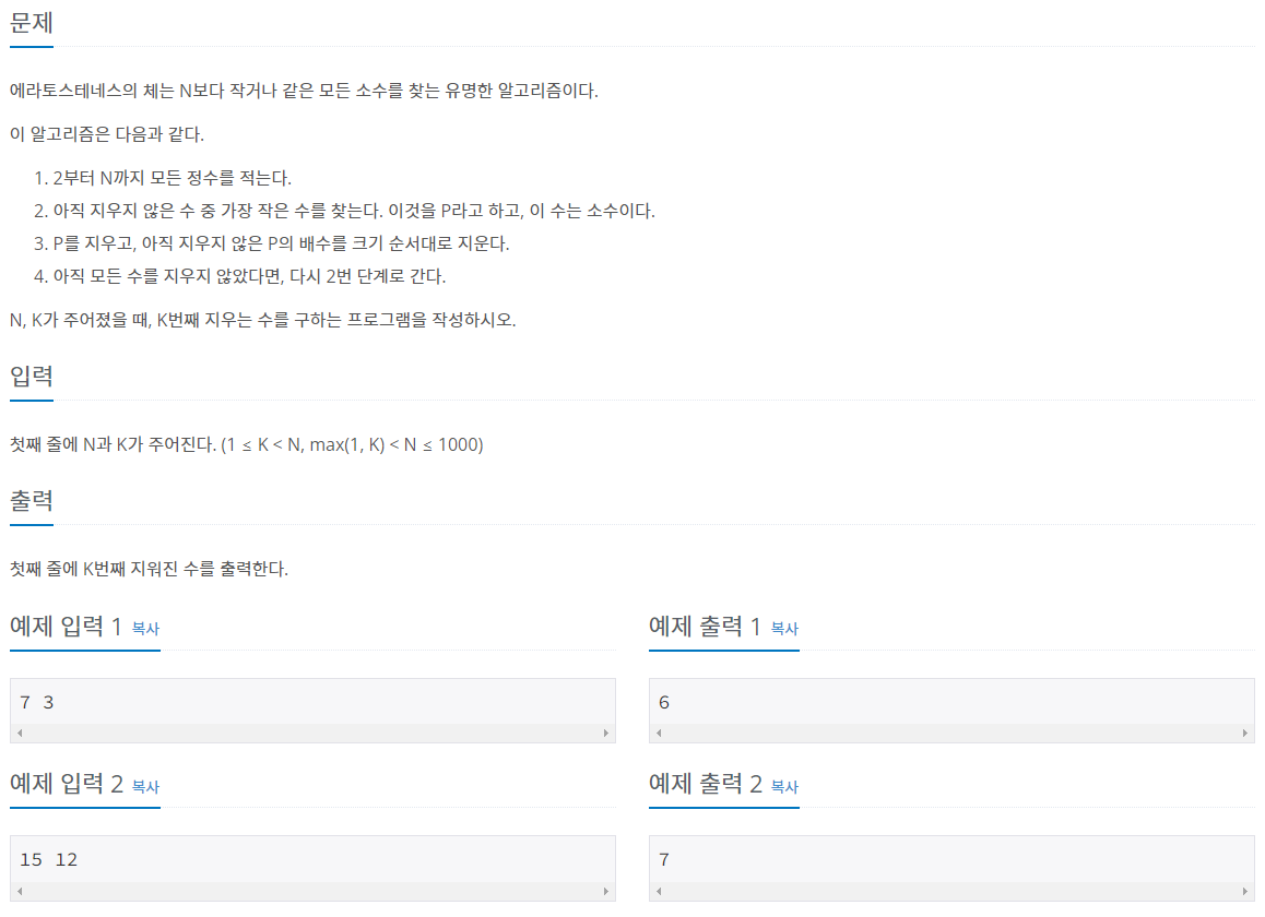 누구나 알고있는 가장 작은 소수인 2부터 시작해서, 2의 배수를 다 지웠으면, 지워지지 않은 수 중에서 다음 값인 3의 배수를 지워나가고 이를 계속해서 반복해 나가면 소수만 남게된다.