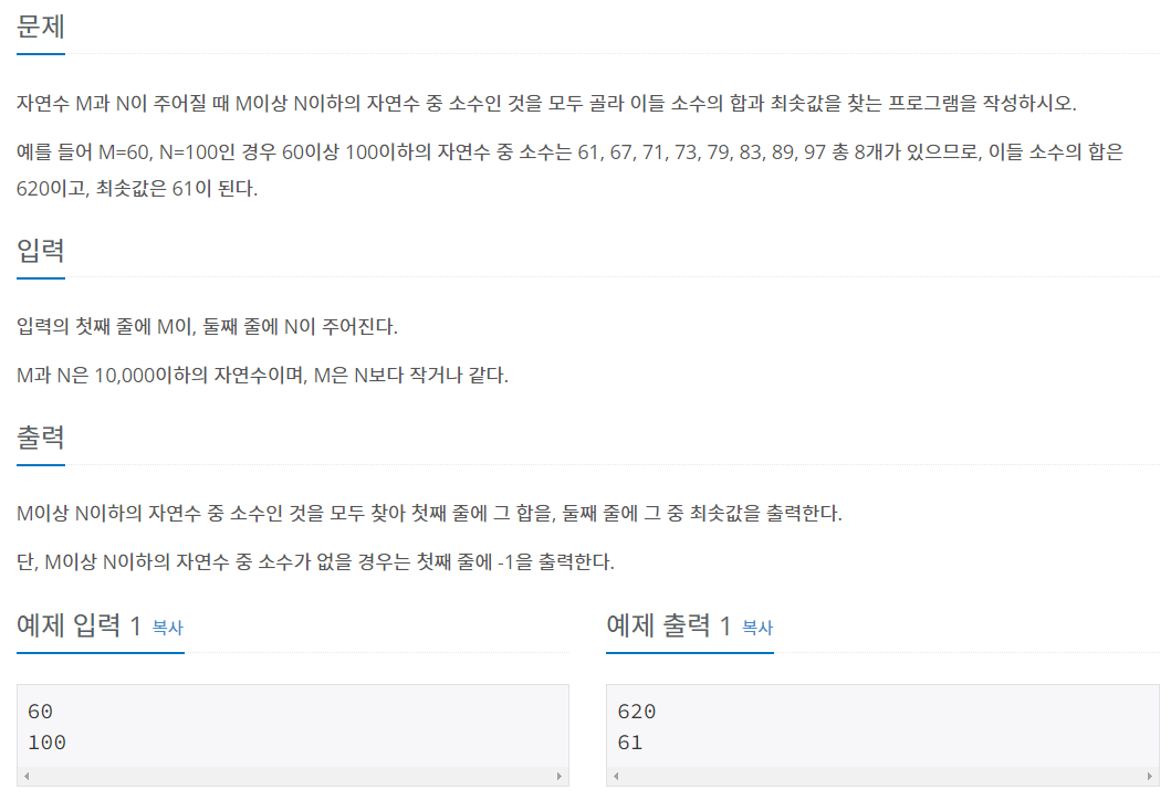 // 소수 최저와 합 구하기