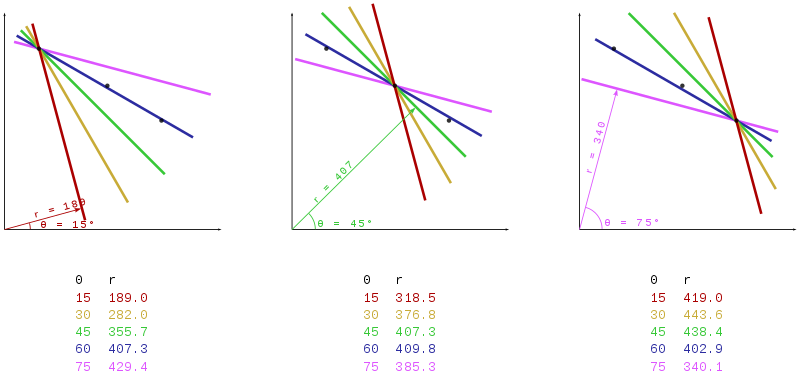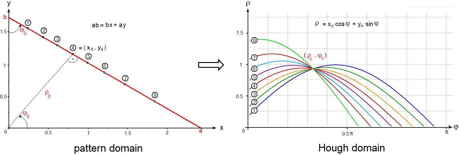 Parameter Space로 좌표계를 바꿀 경우에 하나의 직선을 점으로 표현할 수 있다는 장점이 있다. 일반적으로 Hough Transform은 각 직선을 , 로 표현한다. 즉, 다음과 같은 좌표계에서 일반적으로 나타낸다.