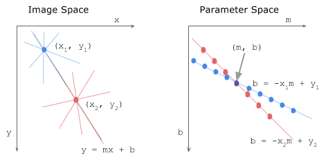 우선 하나의 점을 지나는 직선은 무수히 많다. 하지만, 차선을 직선이라고 생각했을 때 모든 점을 지나는 직선은 단 1개만 존재할 것이다. 하지만 한 점을 지나는 무수히 많은 직선을 그린다면 해당 직선이 다른 점을 지나는지 지나지 않는지 판단하기 어려울 것이다. 따라서 아래 그림과 같이 일반적인 Image Space에서 Parameter Space로 변환시켜준다.