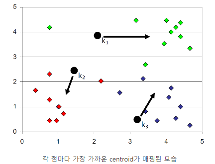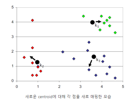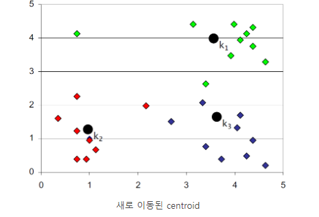 1차적으로 분류된 Data를 기반으로 해서 새로운 중심점을 찾는다. 무게중심 혹은 평균을 기반으로 한다.