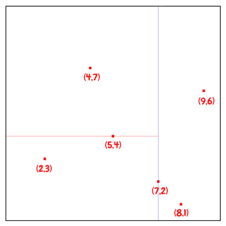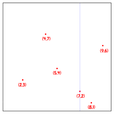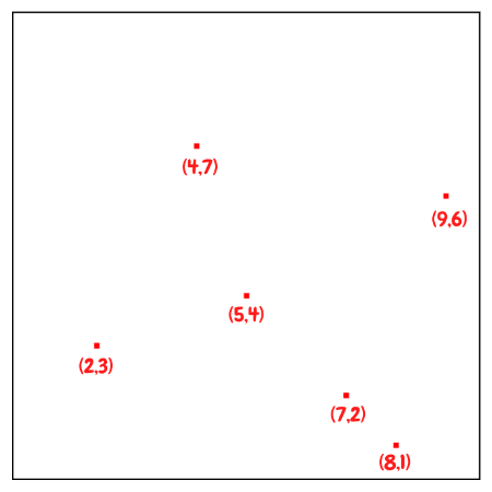 Tree를 구성하기 위한 방법에는 여러 가지가 있는데, 여기서는 균형잡힌 KD Tree를 구성하기 위하여 median값을 사용하는 방법을 통해서 설명하겠다. 2D의 구성단계를 짧게 요약하자면 다음과 같다.
