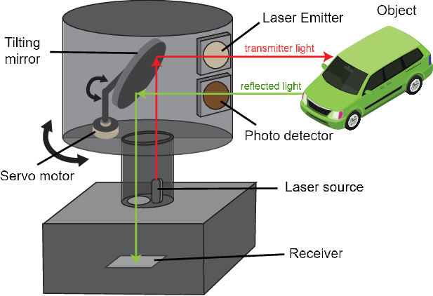 Lidar는 레이저를 쏘아서 거리를 측정하는 Sensor로써, 아래 그림에서 보이는 것과 같이 레이저를 쏘아 객체에 닿은 후 반사되어 돌아오는 것을 측정하여 객체와 센서 사이의 거리를 측정한다. 이때 단방향 Lidar Sesor와 Channel이 여러 개로 360도 회전하는 전방향 Lidar Sensor가 있다.