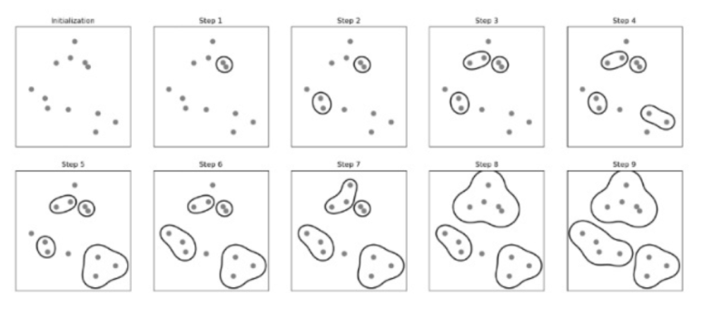Agglomerative Clustering(병합군집화)는 각각의 Point가 하나의 Cluster로 생각하고 병합해나가면서 Clustering을 생성하는 알고리즘이다.