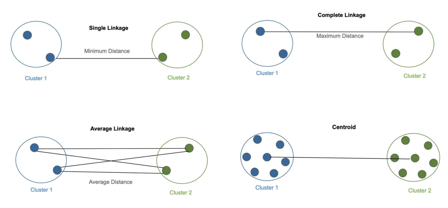 즉, Data 각각이 Cluster이며, 각각의 data들끼리 거리를 측정한 후, 가장 가까이 붙어있는 Data끼리 병합하는 방식이다. 이때 어떻게 합병을 할지에 따라 방식이 달라지게 되는데, 군집을 합병하는 과정에서 군집 간의 거리를 재는 방식은 아래와 같이 여러가지가 있다. 해당 내용을 수업에서는 다루지 않았지만, 나중에 Machine Learning을 공부하다보면, 해당 내용이 등장하기 때문에 참고로 알아두면 좋을 것이다.