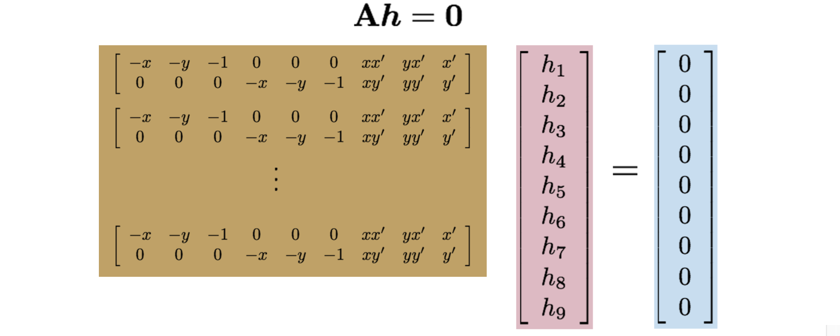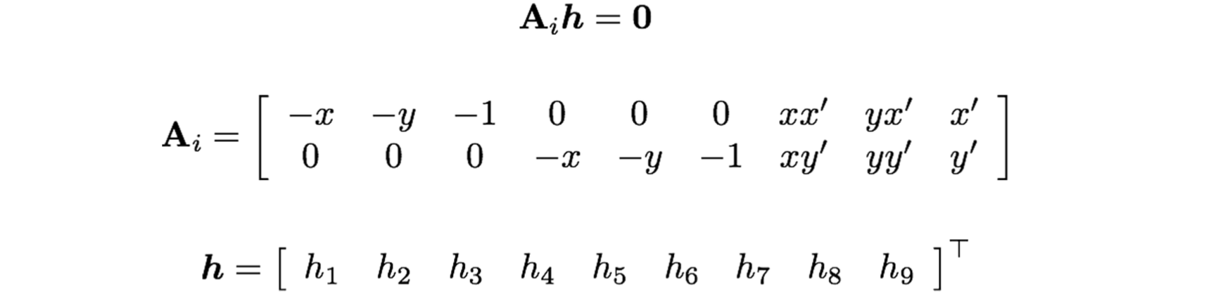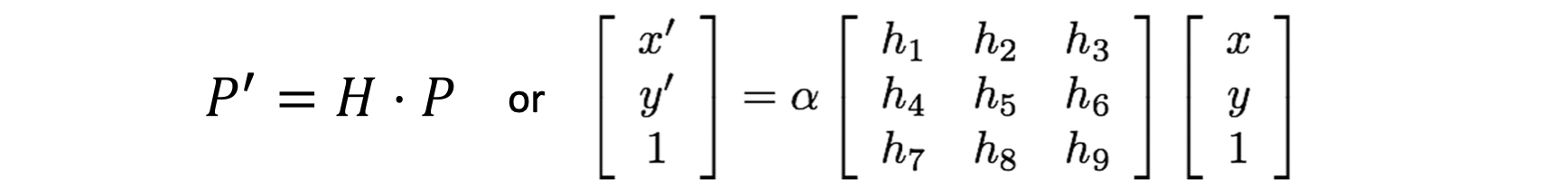 Perspective matrix는 오른쪽에 보이는 수식과 같이 8DOF를 가진다. Homography를 구한다는 것은 오른쪽 수식과 같은 를 구한다는 것과 같다.