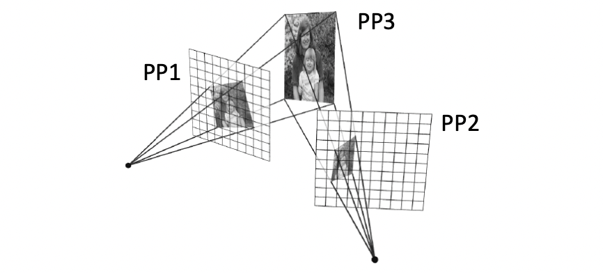 즉, 쉽게 설명하자면 위의 그림처럼 PP1에 있는 모든 점을 PP2에 있는 평면 위로 모든 점을 mapping시킬 수 있는 matrix를 구하는 것이다.