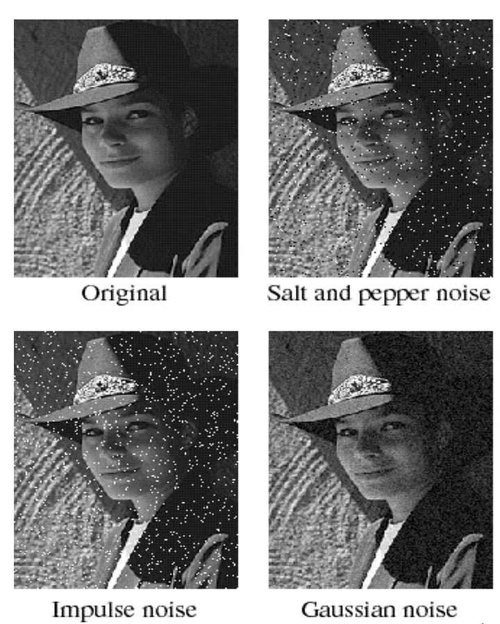Salt and Pepper noise 이외에도 흰색 pixel이 무작위로 나타나는 Impulse noise나 Gaussian distribution에서 추출한 강도 변화를 활용하는 Gaussian noise 역시 Filtering 기술의 일종이다.
