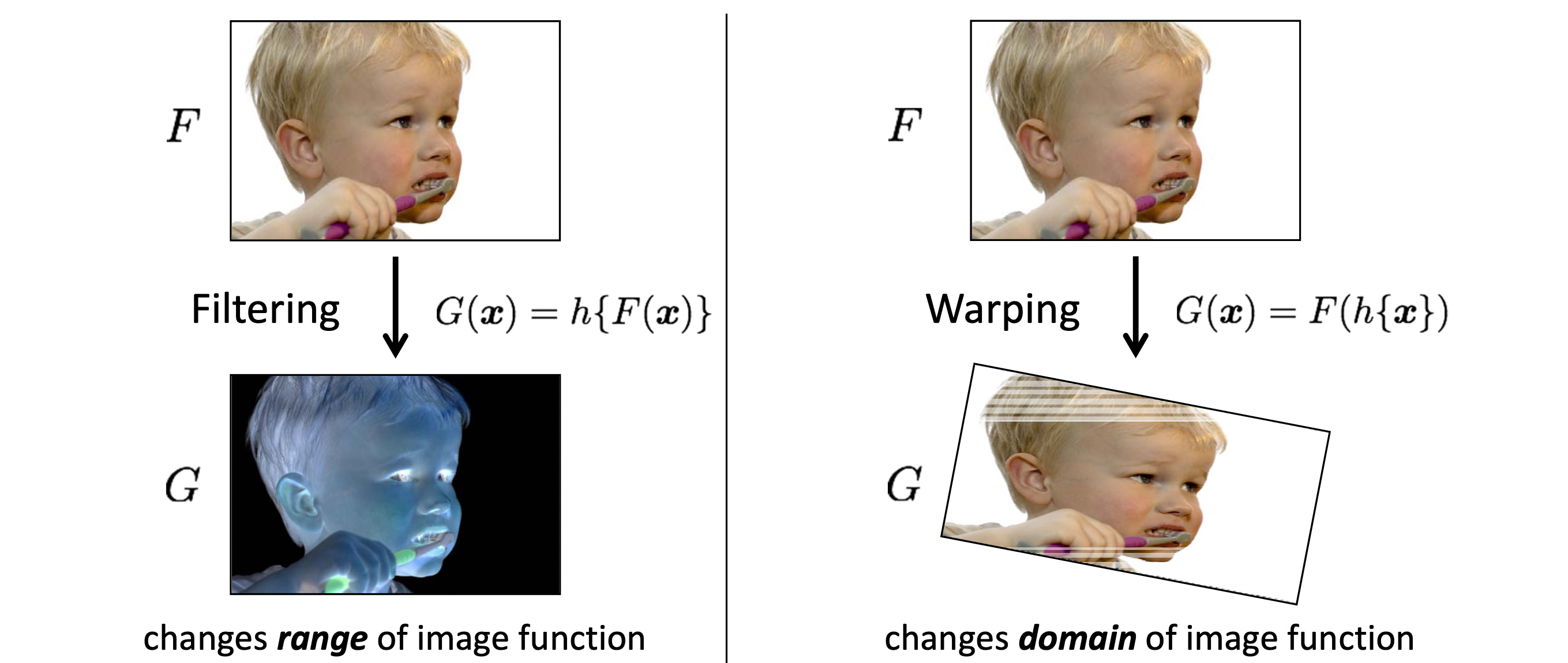즉, Filtering은 왼쪽 그림에서 보는 것과 같이 원본 Image인 를 filtering 함수인 에 넣으면 Pixel 값이 변경된다. 반면에, Warping은 픽셀의 위치인 를 Warping 함수인 에 넣으면 Pixel의 위치가 변경된다.