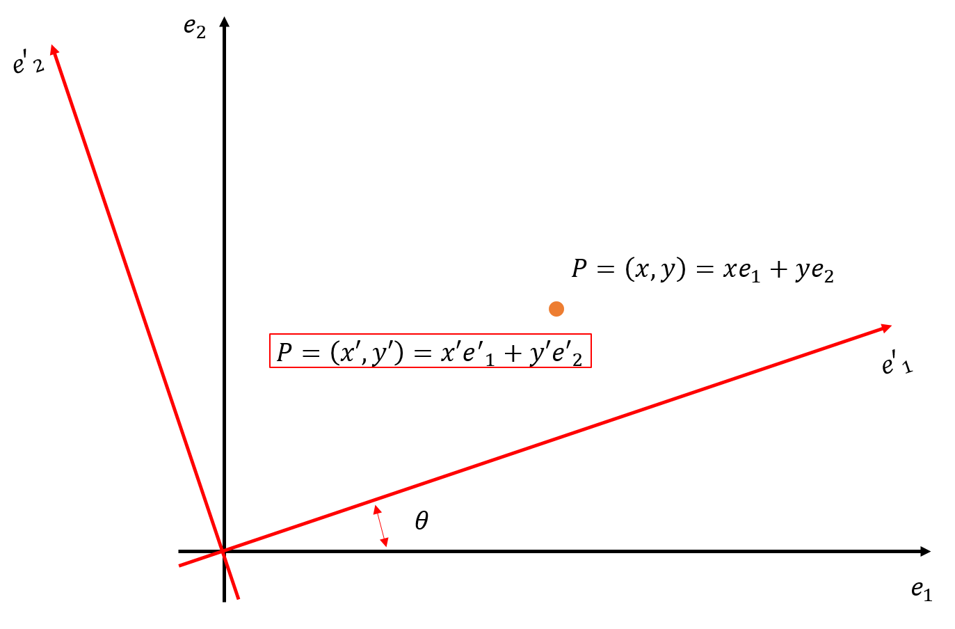 회전된 좌표계에서 점 를 보면 다음과 같다.
