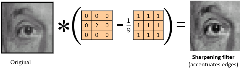 현재 Sharpening filter가 설계된 모습을 보면 filter의 정중만 2배이고 나머지는 0인 filter에서 Average filter를 빼서 설계된 모습을 볼 수 있다. 이를 직관적으로 생각해보자면, 해당 위치의 Pixel값은 2배이고 주변 Pixel은 평균값을 빼서 1개의 Pixel만 두드러지는 효과를 생각해볼 수 있다.