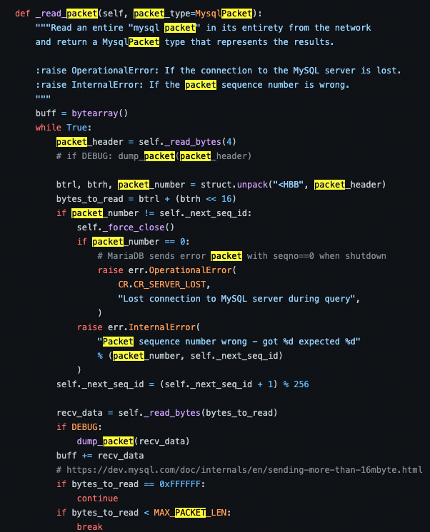 아래와 같은 방식으로 data를 packing하고 이를 socket에 보내게 된다. 즉, pymysql에서는 mysql 서버로 packet을 보낼 때 이를 구분하기 위해 packet에 seq_id를 넣어서 보내게 된다고 이해할 수 있다..