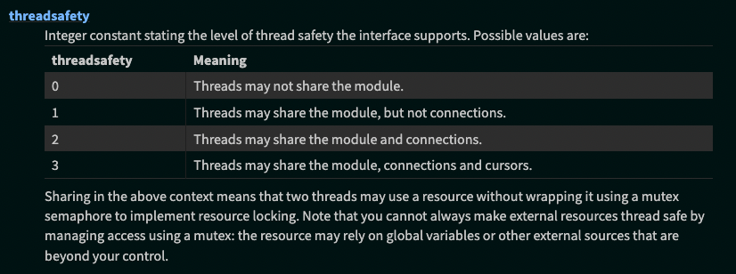 여기서 우리는 pymysql의 threadsafety 레벨이 1인것을 알 수 있고 이에 따라 connection에 대한 thread safety가 적용이 안되는 것을 알 수 있다.
