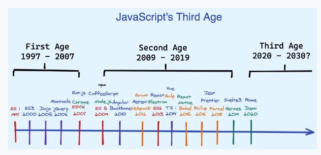 - 오늘날 생태계의 핵심을 이루는 Node.js, NPM, Transpiler, 빌드/번들러, 다양한 프레임워크가 등장하여 한 번 더 큰 도약을 이루어낸 시기였다.