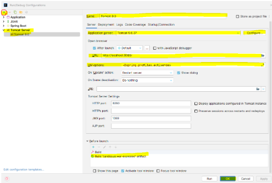 4. 플러스 버튼 클릭후 Tomcat Server (local) 추가해주기 Name은 임의로 Tomcat 9.0으로 설정