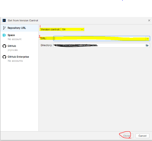 - IntelliJ IDEA를 열고 Get from VCS -> Repository URL -> Git에서 Git Server URL 입력