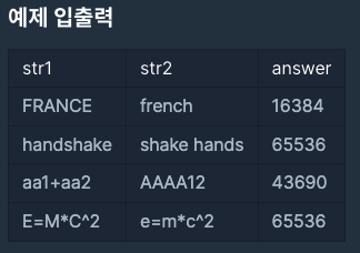 입력으로 들어온 두 문자열의 자카드 유사도를 출력한다. 유사도 값은 0에서 1 사이의 실수이므로, 이를 다루기 쉽도록 65536을 곱한 후에 소수점 아래를 버리고 정수부만 출력한다.