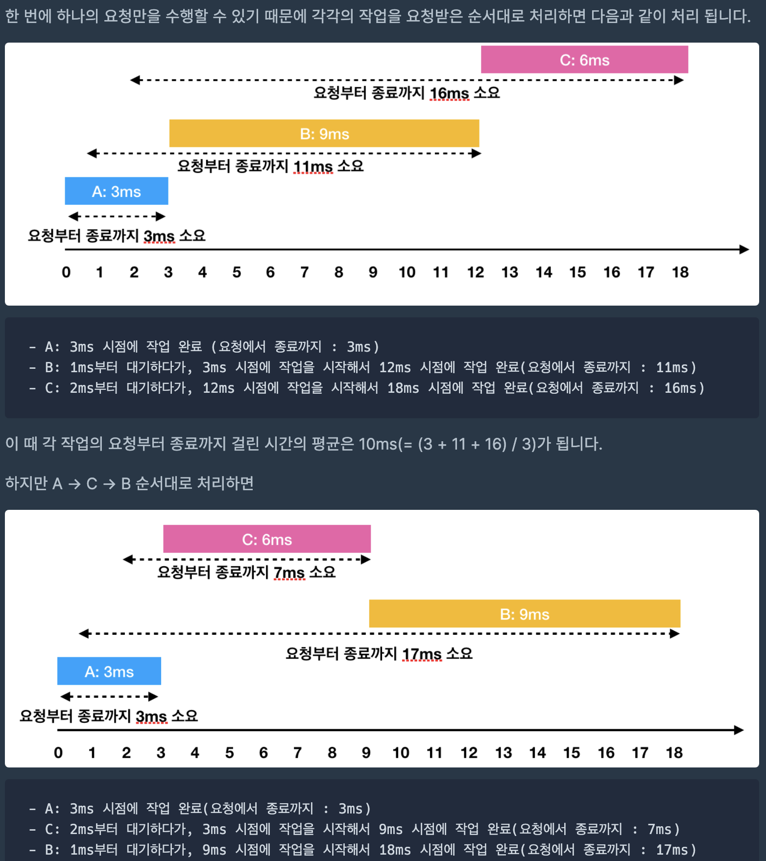 이렇게 A → C → B의 순서로 처리하면 각 작업의 요청부터 종료까지 걸린 시간의 평균은 9ms(= (3 + 7 + 17) / 3)가 됩니다.
