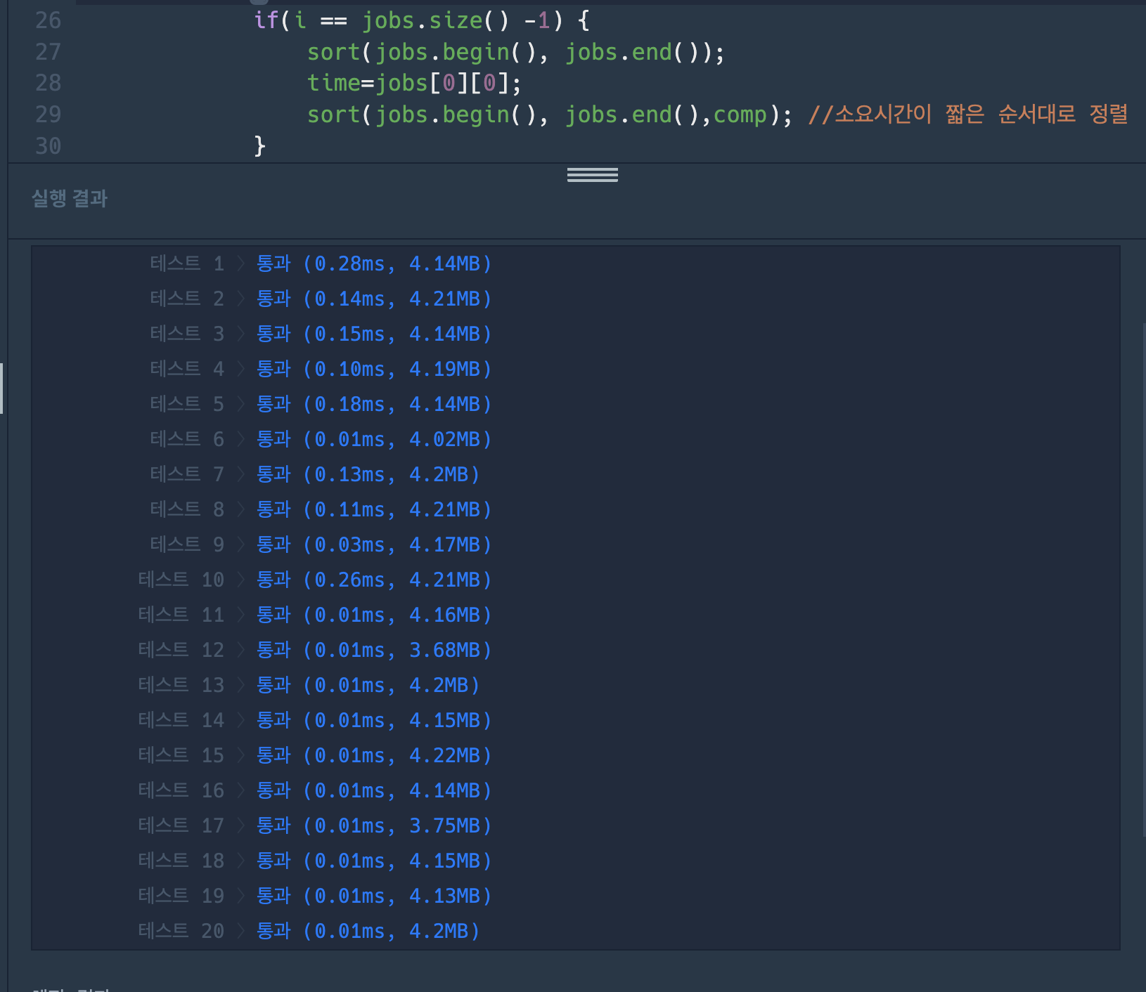 sort(jobs.begin(), jobs.end(),comp); //소요시간이 짧은 순서대로 정렬