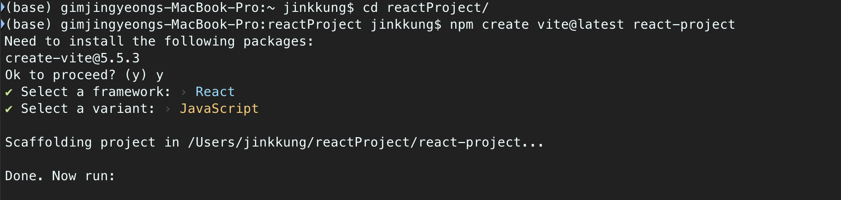 그리고 사용할 framework, variant를 순차적으로 선택해주면 리액트 프로젝트가 생성된다.