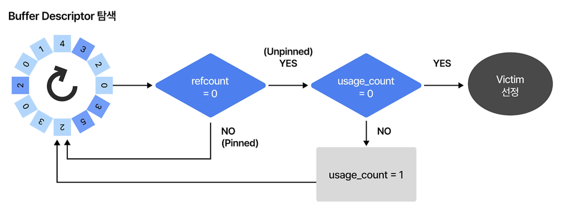 buffer descriptor의 ref_count와 usage_count를 참조하여 victim을 선정한다.