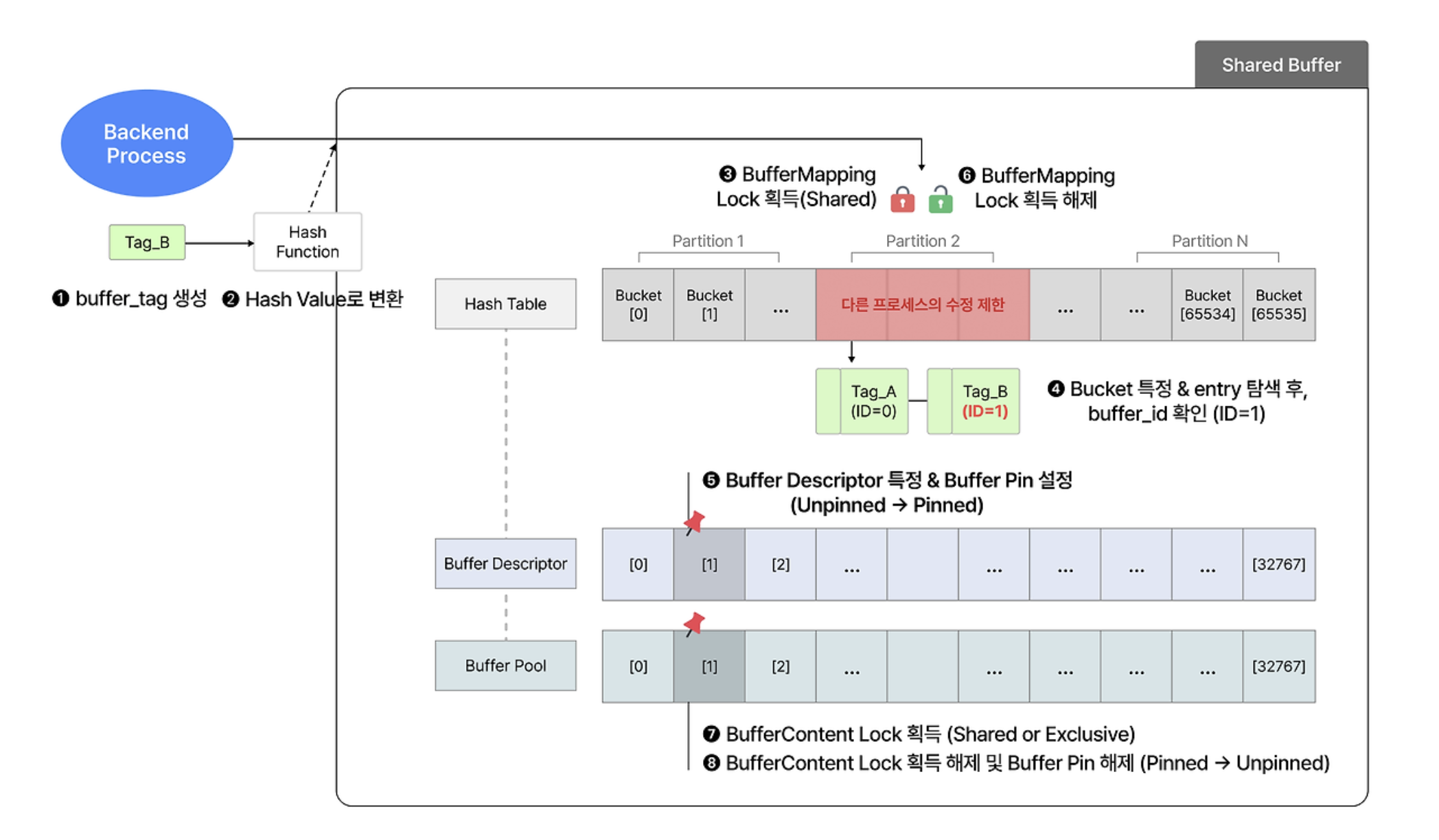 buffer tag로 해시 값 얻어서 BufferContent lock 걸고 bucket에 접근한다.