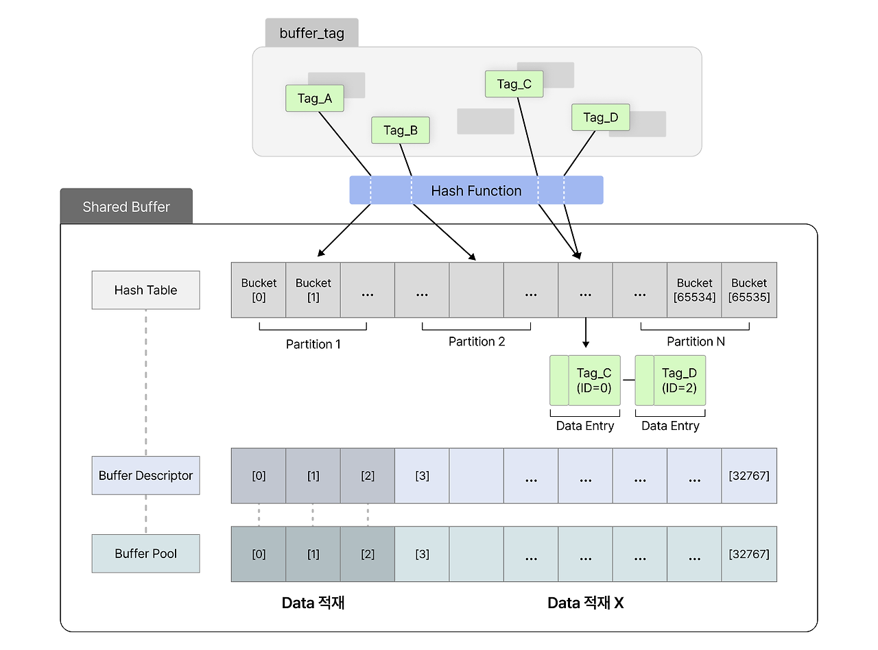 그리고 위에서 살펴봤듯, 생성된 buffer tag는 해시 함수를 거쳐 얻어낸 해시 키로 대응되는 bucket과 연결된다.