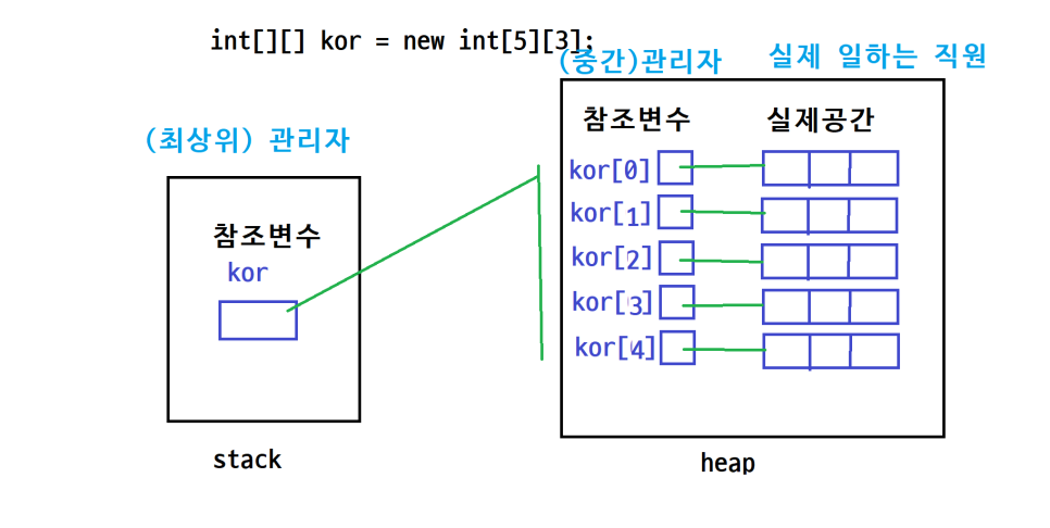 // 2) 5개 참조변수가 3개 배열공간을 생성한다