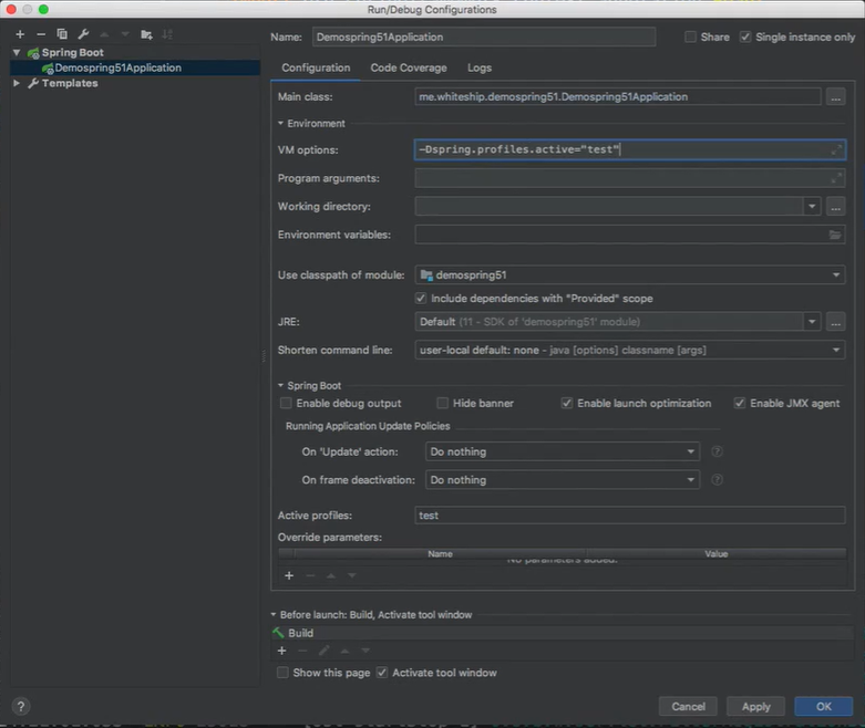 💥오류가 난다. Why? ⇒ profile이 test로 설정되지 않았기 때문에. 그렇다면 Profile을 설정해보자.