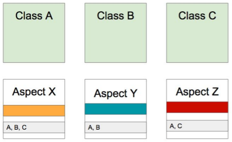Aspect : 묶은 것 = 모듈(하얀 박스)Target : 적용이 되는 대상(Class A, B, C)(녹색 박스)Advice : 해야할 일들(색 띠)Join point : 합류점, 메소드 실행 시점(등 그 외 여러 지점)에 Advice를 끼워 넣어라.Pointcut : Join point의 SubSet, 어디에 적용 해야하는지 (회색 박스 안 A,B,C)AOP 구현체