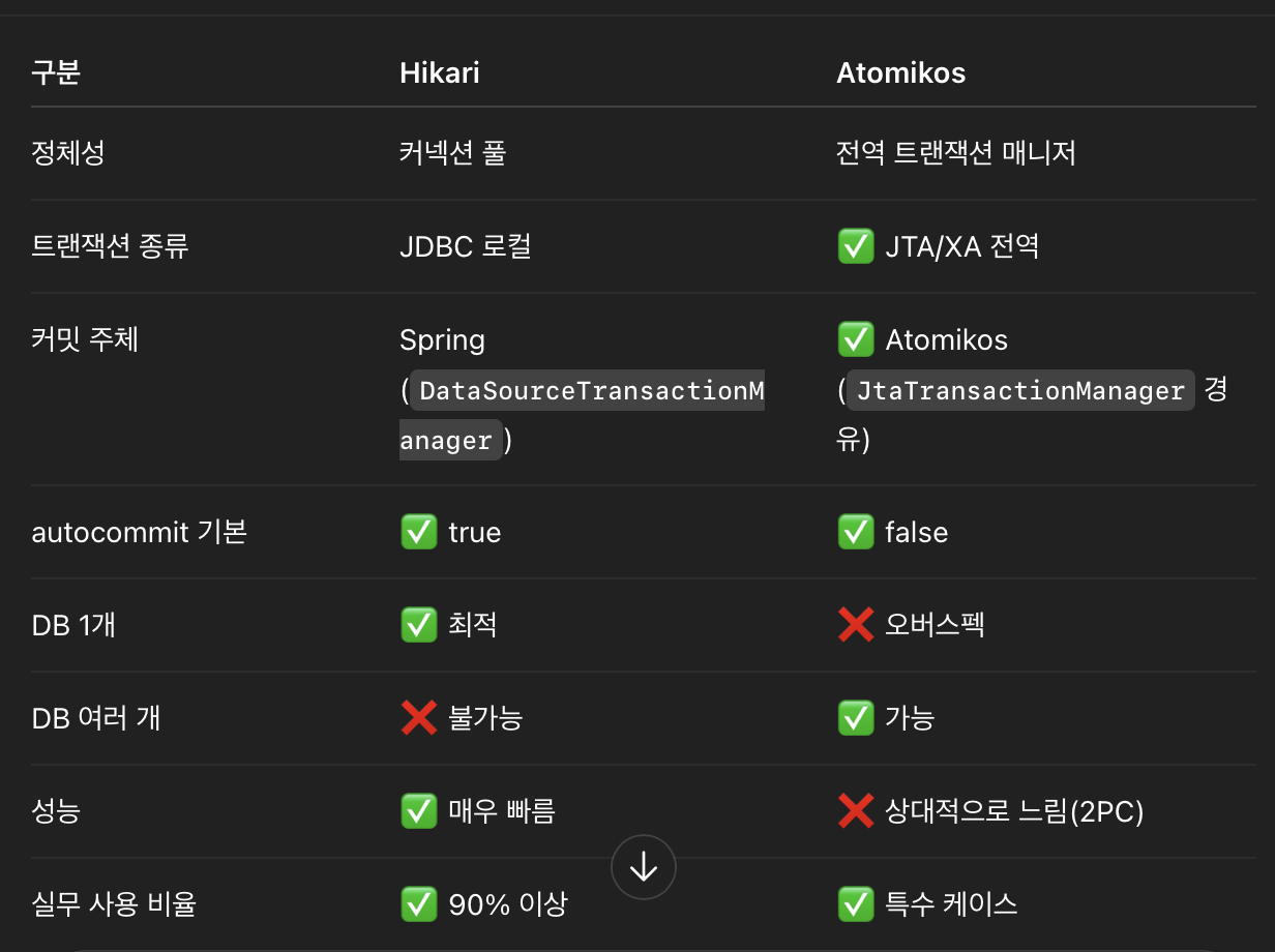 ✅ 3️⃣ Hikari vs Atomikos 핵심 비교표