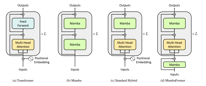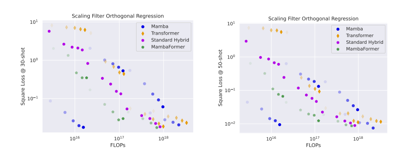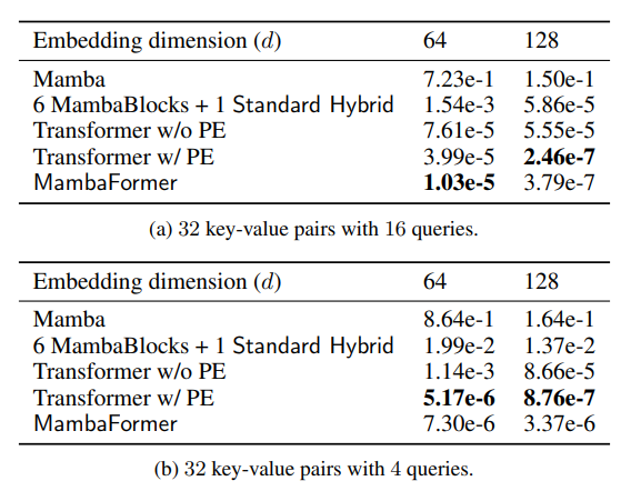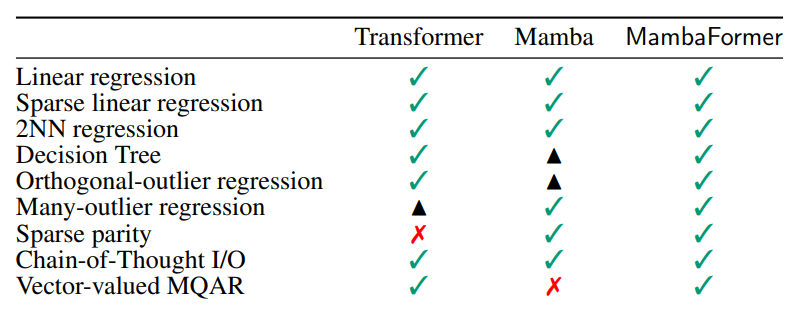 - Hybrid architecture MambaFormer achieves best-of-both-worlds performace