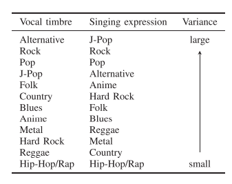 수집한 데이터셋의 노래 장르 label을 사용하여 각 장르에서 노래하는 목소리의 특성 표현의 차이를 조사함. 이때 각 장르의 노래 표현의 분산(해당 장르의 평균 표현에서 각 표현의 L2 거리의 제곱 평균)을 계산하고 분산순으로 주요 장르를 나열함.