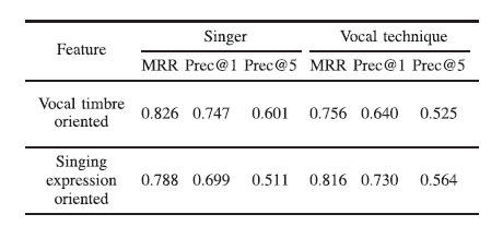 vocal timbre-oriented은 쿼리로 사용된 동일한 가수의 노래 목소리를 검색하는 측면에서 우수한 성능을 나타냄. 반대로, singing expression-oriented은 동일한 음성 기술을 가진 노래 목소리를 검색하는 경우에 더 좋은 성능을 나타냄. Student의 t-검정을 수행했을 때 MRR, Prec@1 및 Prec@5의 모든 지표가 가수 및 음성 기술에 대해 p < 0.001임. 즉, 둘 다 유의미하게 다른 성능을 나타냄.
